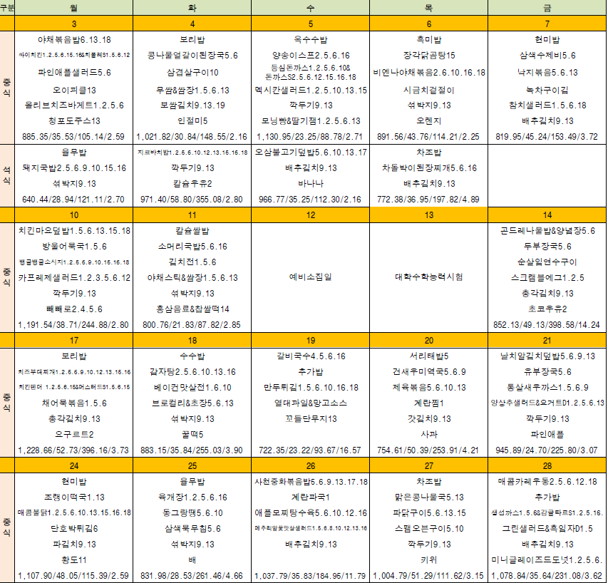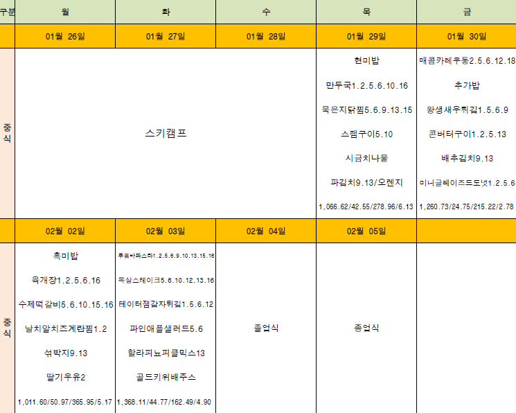 급식식단표